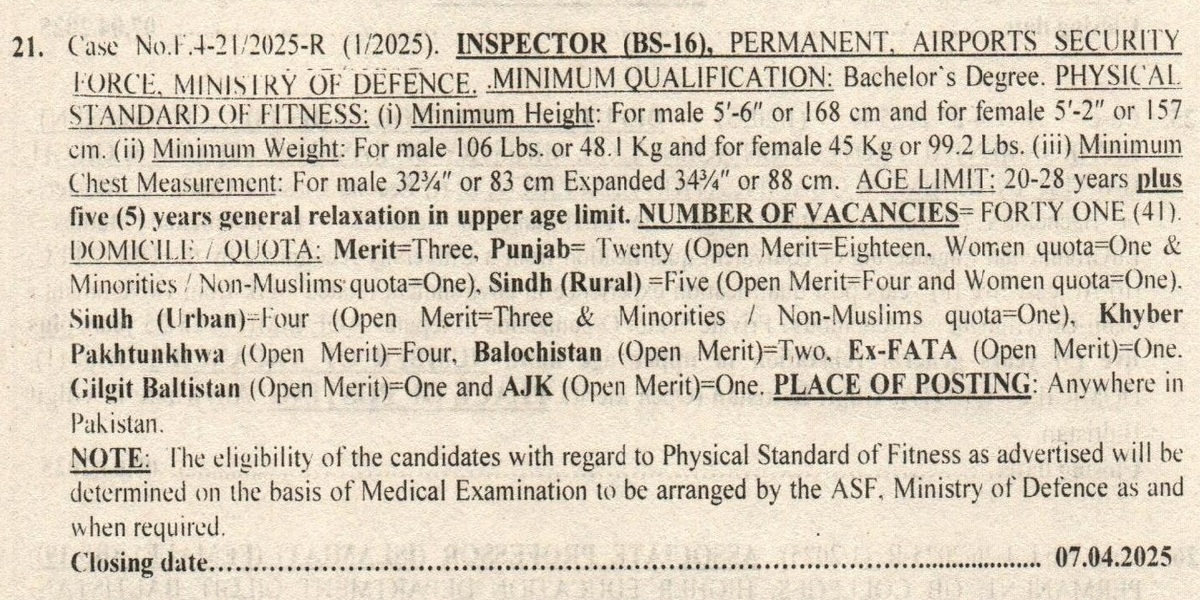 ASF Jobs 2025 You can apply to Pakistan Airport Security Force, in which candidates with Matriculation, Intermediate, Bachelor, and Master degrees can apply. Vacancies have been announced for each department in the Pakistan Airport Force, to which men and women from all over Pakistan can apply. All the details have been provided to you on this page. For more information, you can read the given advertisement. All the information is available above the advertisement. This is a great opportunity for you. You can take advantage of it. To get the application form, you can visit the official website of the Pakistan Airport Force.