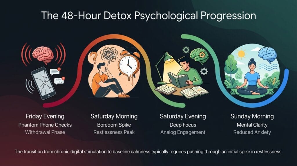 Saturday morning is always the roughest part. The first few hours feel incredibly uncomfortable. You will notice “phantom buzzing”—the feeling that your phone is vibrating when it isn’t. I constantly find my hand reaching for my pocket out of pure muscle memory.